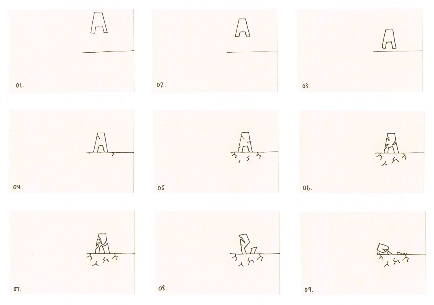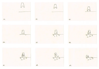 Today we where set the task of picking three words from a randomiser. We had no choice what they would be, all we knew was that we would have to work with them for our next brief. I landed on the following three words; crunch, bounce and extend. After we were assigned three words we where then in an afternoon 'flip book' session. We where taught how relevant these little, post it sized (and coloured) books could become to our future project. We had to choose a letter and animate in any way on the page. I chose an upper case A and thought it would be interesting to see it fall to the ground and crumble. Below is a youtube video of my flip book in action.